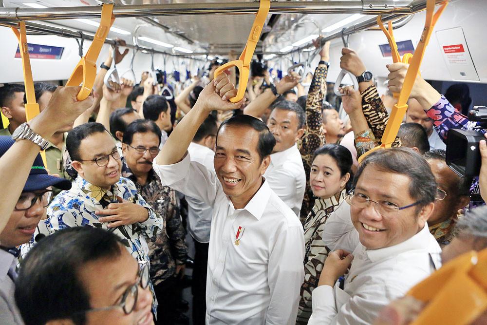 Joy ride: President Joko “Jokowi” Widodo (center) accompanied by several Cabinet ministers and Jakarta Governor Anies Baswedan (second left, in white and blue batik) rides the MRT Jakarta from Bundaran HI Station in Central Jakarta to Lebak Bulus in South Jakarta on Tuesday. The MRT jakarta will begin operating commercially on March 24. (The Jakarta Post/Seto Wardhana)