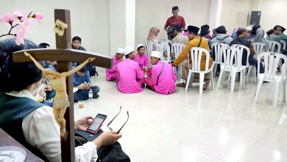 Solidarity: Muslims break the fast at the Santa Maria Catholic Church in Surabaya, East Java, on Monday. The interfaith gathering was held to remember the victims of the suicide bombings carried out by an Islamic State-inspired family a year ago. On May 13, 2018, a family of six — including two girls aged 9 and 12 — blew themselves up at the Santa Maria Catholic Church and two other churches in Surabaya during Sunday morning services, killing 25 including six church congregants. (The Jakarta Post/Wahyoe Boediwardhana )