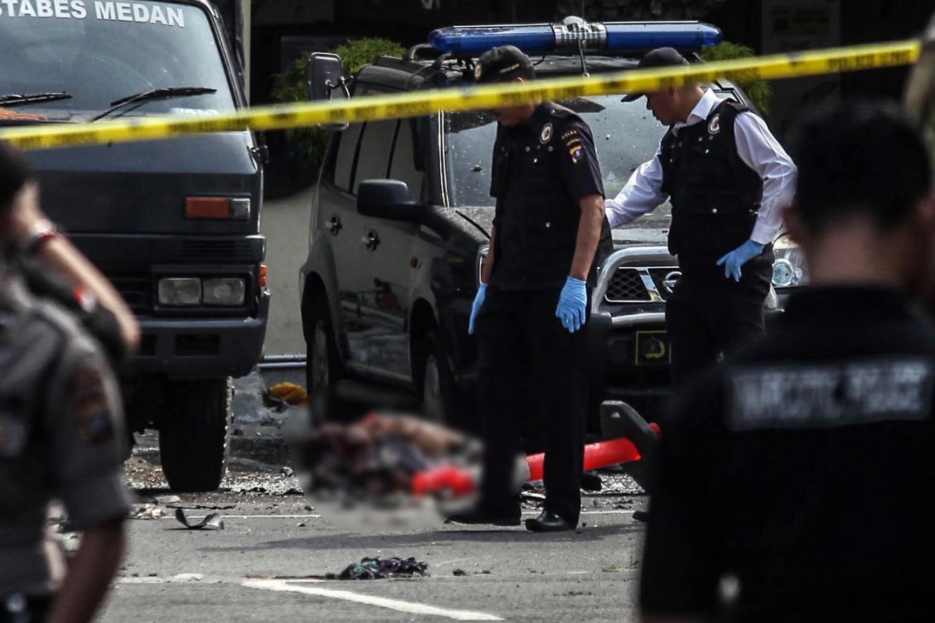 EDITORS NOTE: Graphic content / Indonesian police examine a body of a suspected suicide bomber at their headquarters in Medan, North Sumatra, on November 13, 2019, after a suicide attack occured during their morning roll call. - A suicide bombing outside a police station in Indonesia has left at least one attacker dead, authorities and media reports said, with no immediate confirmed reports of other deaths or injuries. (AFP/Albert Damanik)