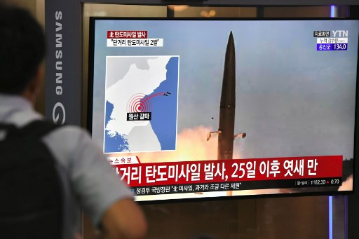 A man watches a television news screen showing file footage of a North Korean missile launch, at a railway station in Seoul on July 31, 2019. Pyongyang fired two ballistic missiles on July 31, Seoul said, days after a similar launch that the nuclear-armed North described as a warning to the South over planned joint military drills with the United States. (AFP/Jung Yeon-je )