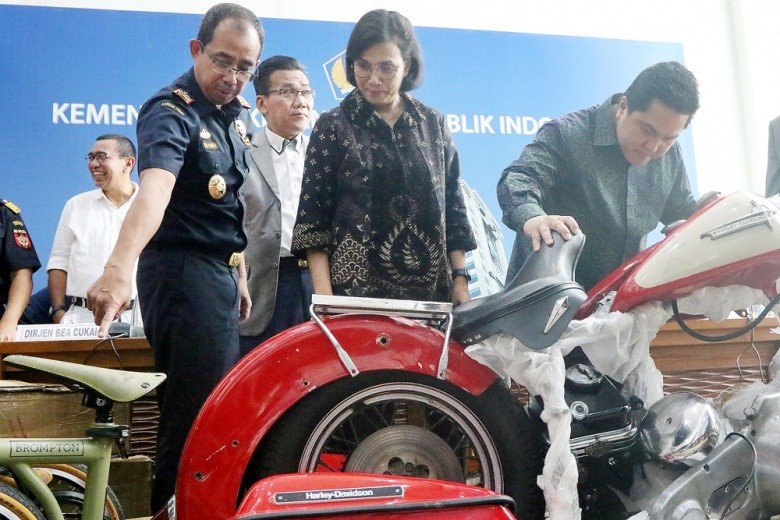 Hot wheels: State-Owned Enterprises Minister Erick Thohir (right) and Finance Minister Sri Mulyani Indrawati (center) check out a Harley-Davidson motorcycle and a Brompton bicycle allegedly smuggled into Indonesia on a Garuda Airbus A330-900 Neo aircraft, during a press conference at the Finance Ministry in Jakarta on Thursday. (JP/Dhoni Setiawan)