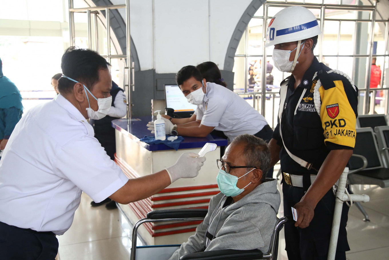 An officer at Pasar Senen Train Station, Central Jakarta on Monday, March 16, 2020 checks the temperature of a long-distance railway passenger before entering the Station's waiting room. Some people go home or go home even though there is already an appeal to be better at home than to travel and gather in a crowd. (JP/ P.J.Leo )
