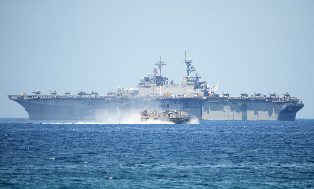 A US Navy hover craft speeds past the USS Wasp, US Navy multipurpose amphibious assault ship, during the amphibious landing exercises as part of the annual joint US-Philippines military exercise on the shores of San Antonio town, facing the South China sea, Zambales province on April 11, 2019. (AFP/Ted Aljibe)