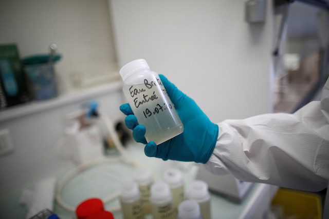 A water quality scientist holds a water sample at the Eau de Paris research and analysis laboratories in Ivry-sur-Seine near Paris on July 22. Scientists study the Paris waste water to detect the concentration of COVID-19 traces as France remains vigilant regarding the spread of the coronavirus disease. (Reuters/Benoit Tessier)