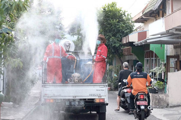 Two motorcyclists pass workers spraying disinfectant from a pickup truck on Oct. 4, 2020 in the Wijilan Kidul neighborhood of Kraton district, Yogyakarta. Neighborhood and community units have been assisting the government implement the national COVID-19 measures, albeit quietly and without any media splash. (JP/Donny Fernando)