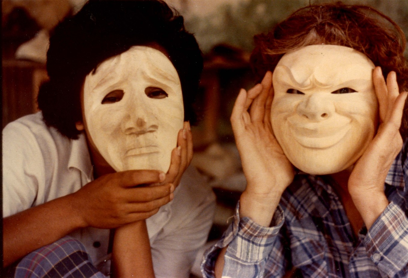 Ida Bagus Anom and Leonard Pitt displaying the masks they carved in 1978 when Pitt went back to Bali to further his mask-carving talents. He often holds workshops in Berkeley or elsewhere where students learn how to carve masks, wear them and use mime and dance to bring them to life. (Leonard Pitt, My Brain on Fire, 2016/File)