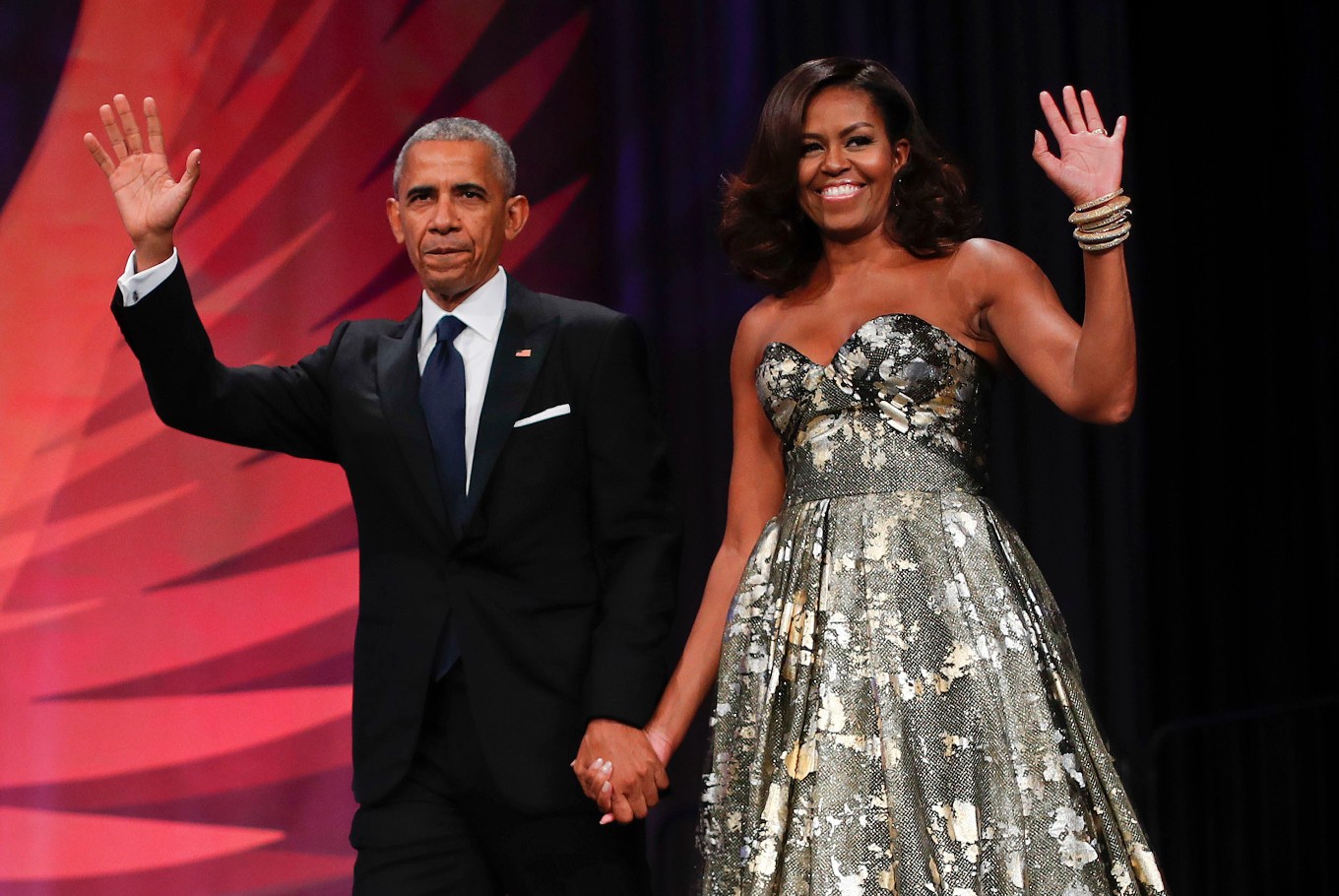 In this Sept. 17, 2016, file photo, President Barack Obama and first lady Michelle Obama wave at the Congressional Black Caucus Foundation's 46th Annual Legislative Conference Phoenix Awards Dinner in Washington. The publishing of the upcoming books by Barack and Michelle Obama will be a global event. Penguin Random House announced Monday, March 13, 2017, that it has lined up publishers from Ireland to South Africa for the two books, to be released by the Crown imprint in the U.S. and Canada. Titles and release dates have not been announced. (AP/Pablo Martinez Monsivais)