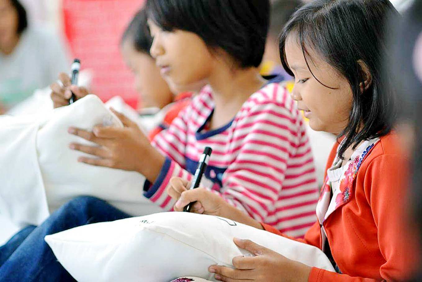 n a Sunday afternoon, a group of children, whose ages ranged from 6 to 15, joined a workshop in a room at the National Library of Indonesia on Jl. Medan Merdeka Selatan in Central Jakarta. They concentrated on drawing their fantasies on top of a pillow, as adult facilitators and parents looked on.