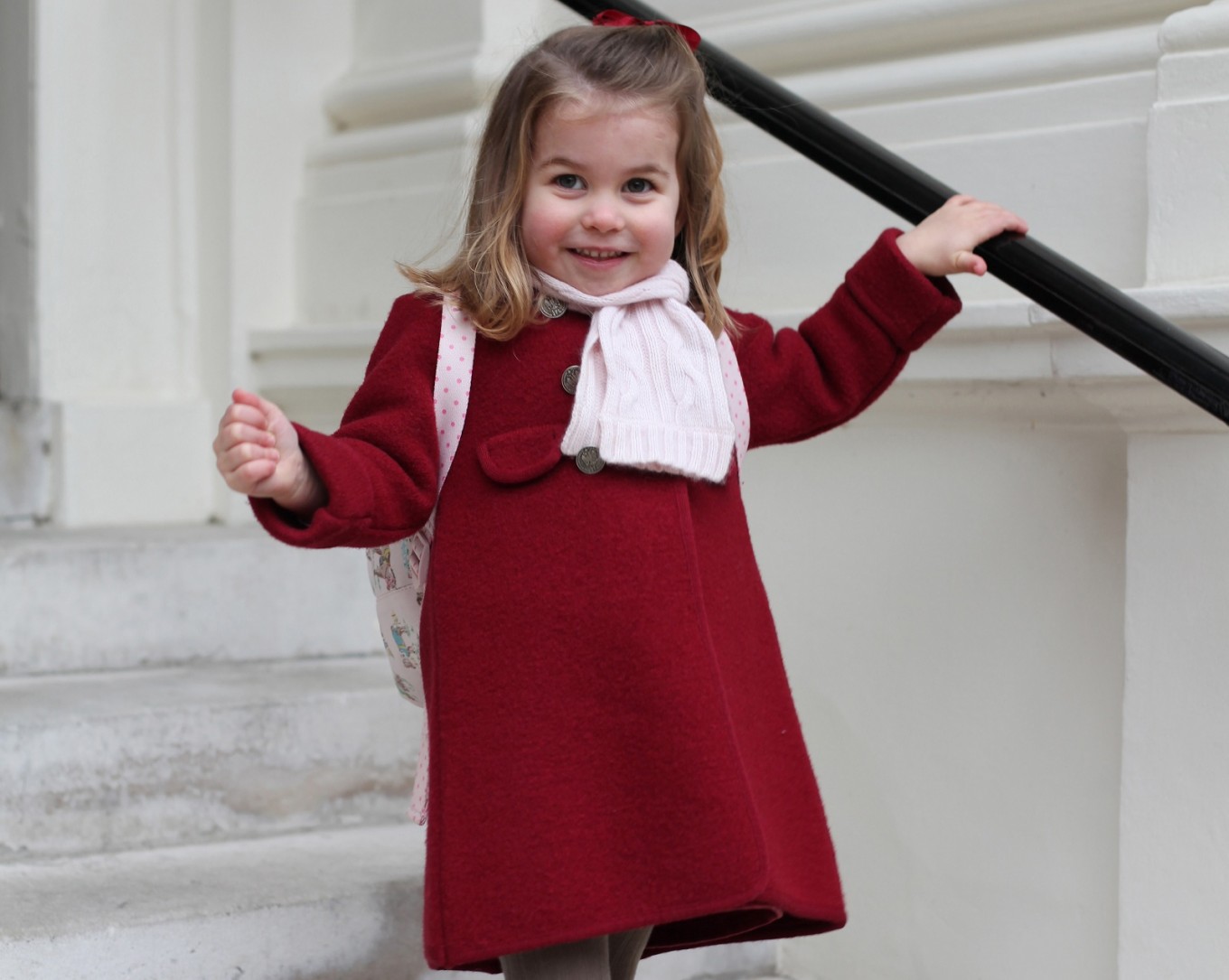 Sporting a red coat, a light pink scarf and a pink backpack, the two-year-old princess posed for pictures taken by Duchess Catherine (Kate Middleton) outside Willcocks Nursery School.