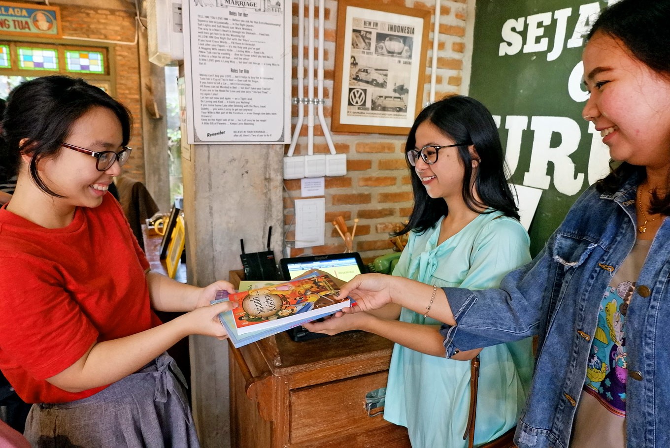 While sketching at Hotel Indonesia traffic circle in Central Jakarta during Car Free Day one Sunday morning, Destawan had the idea of asking people to pay for sketches with books instead of money.