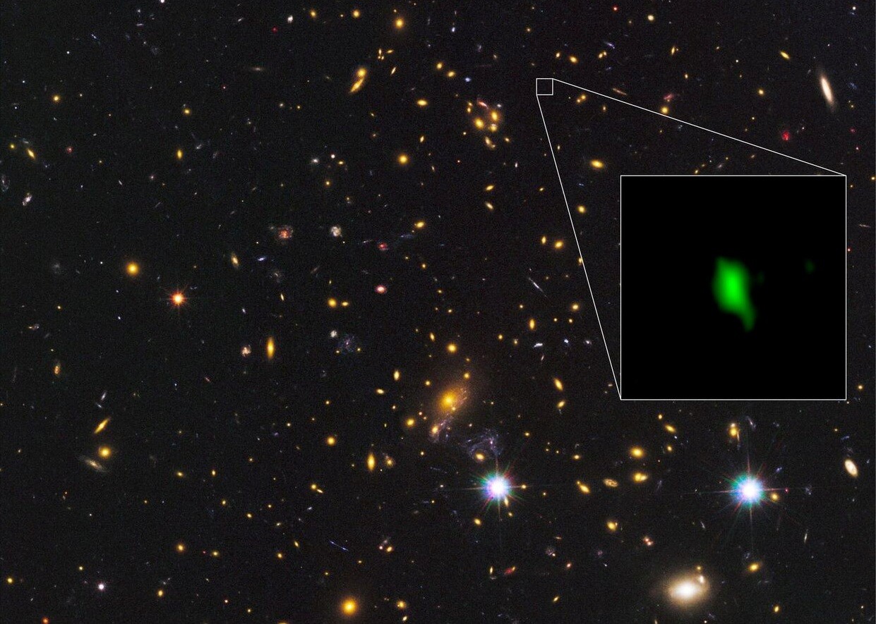 This Hubble Space Telescope image shows the galaxy cluster MACS J1149.5+2223 and the inset image shows the galaxy MACS1149-JD1, with the detected oxygen distribution in green, observed with the Atacama Large Millimeter/submillimeter Array (ALMA), an astronomical interferometer of radio telescopes in the Atacama desert of northern Chile. The image was released May 16, 2018. (ALMA (ESO/NAOJ/NRAO), NASA/ESA Hubble Space Telescope, W. Zheng (JHU), M. Postman (STScI), the CLASH Team, Hashimoto et al/Handout via REUTERS/File)