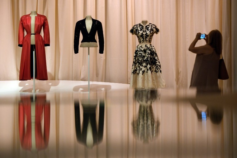 A visitor takes a picture with her smartphone Gala's dresses 'Long coat, open at the front from top the bottom' (L), 'Night's jacket' (C) and 'Blouse and Shirt of Silk, sequins, gemstones, ribbons' (R) designed by Christian Dior during the exhibition entitled 'Gala Salvador Dali, a room of its own in Pubol' at MNAC (National Art Museum of Catalonia) in Barcelona on July 5, 2018. (AFP/Lluis Gene)