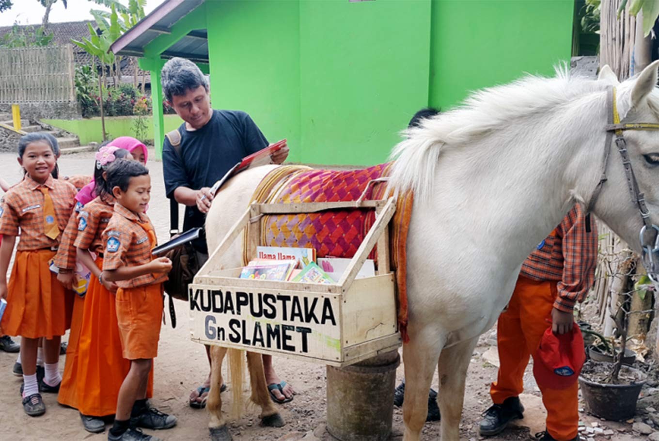 For example, Ridwan Sururi is a volunteer who operates in the area of Purbalingga, Central Java and he rides a horse or motorcycle to carry books to schools and Islamic boarding schools to host storytelling or environmental activities.