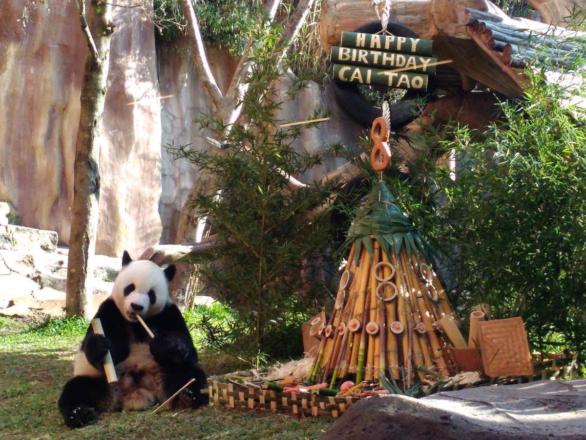 The celebration was a public event on Saturday afternoon and the TSI management also gave birthday presents — a panda-shaped cake with yellow rice — to visitors who shared their birthday with Cai Tao.