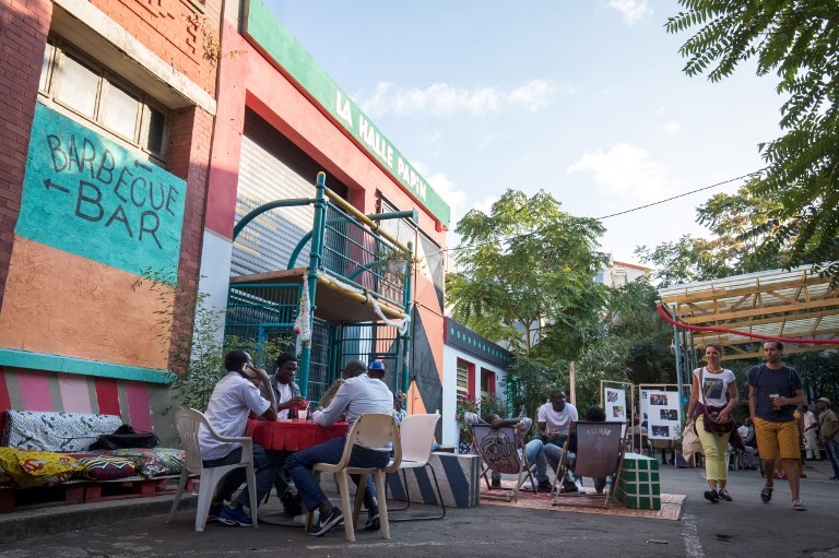 In this file photo taken on August 18, 2018 people sit and enjoy the bar of the Halle Papin, on August 18, 2018, in Pantin, on the outskirts of Paris. The cultural and festive activities of the wastelands of the French department Seine-Saint-Denis, northern Paris, leads Parisians to cross the ring road and go outside Paris. (AFP/Thomas Samson)