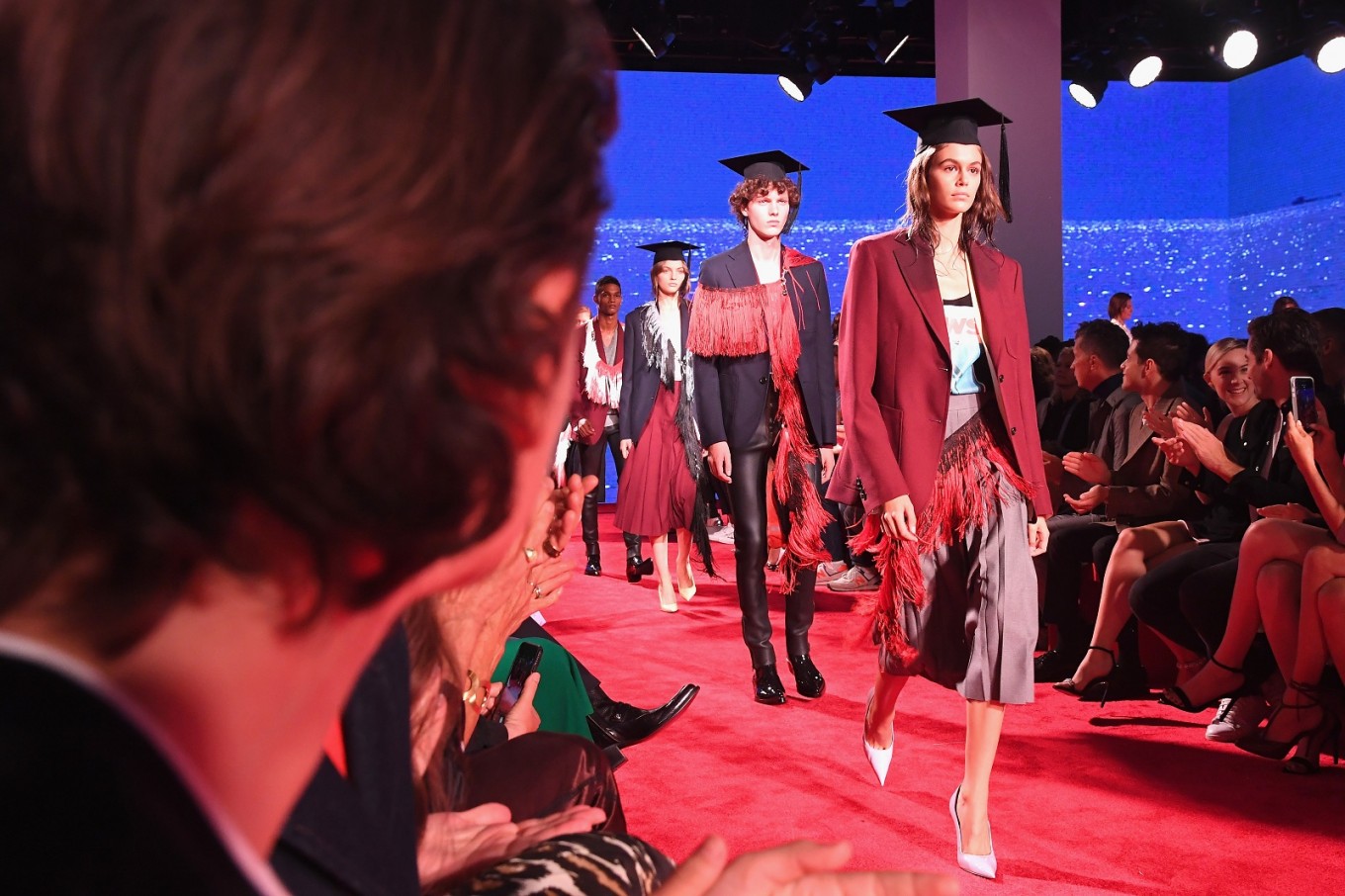 Contrast came from the school's out look -- Cindy Crawford's 17-year-old daughter Kaia Gerber walking down the runway in a blazer and black mortar board -- a nod to movie "The Graduate."