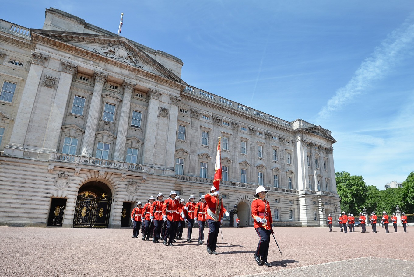 Buckingham Palace was originally a large house built in 1703 and was acquired by King George III in 1761. It was extended in the reign of Queen Victoria while the front was refaced in 1914 when George V was king.
