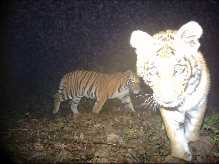 This handout photograph taken by a camera trap on February 16, 2018, and released by Nepal's Department of National Parks and Wildlife Conservation (DNPWC) and World Wide Fund for Nature (WWF) shows Bengal tigers in the Shuklaphanta National Park, some 510 kilometers from Nepal's capital Kathmandu. (Handout/DNPWC/WWF/AFP/-)