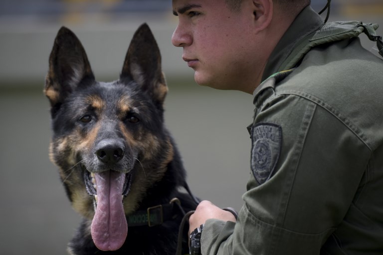 Colombian drug-sniffing dog Sombra (Shadow) is seen at El Dorado International airport in Bogota on July 27, 2018. Dogs can be trained to sniff out certain cancers, people at risk of a diabetic coma and now, children with malaria just by smelling their socks, researchers said Monday. (AFP/Raul Arboleda)