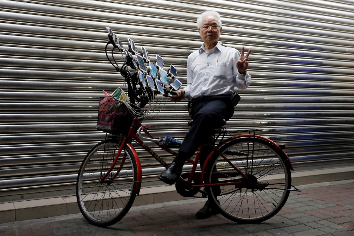 Attached to the front of his bicycle are 15 mobile phones which Chen, 70, uses to simultaneously play the augmented-reality game Pokemon Go.