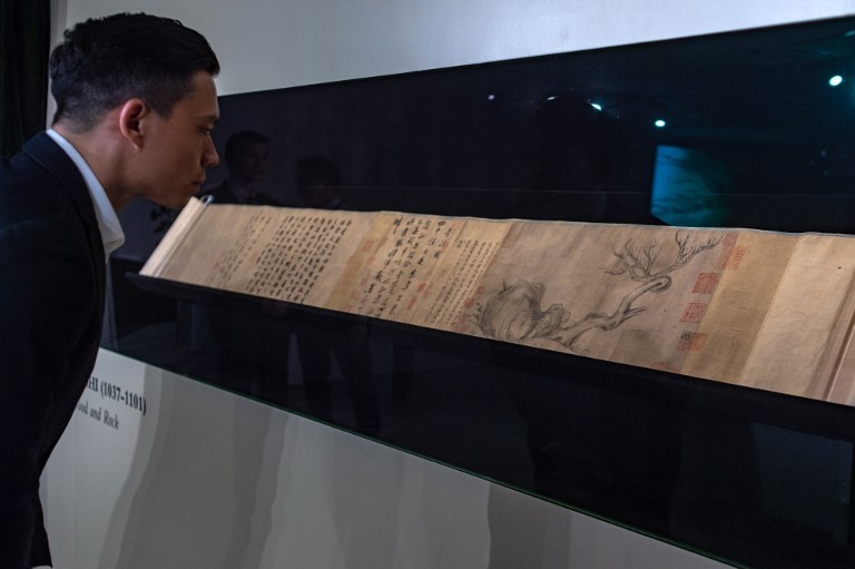 The 185.5cm-long scroll is inscribed with calligraphy and the poems of four important literati of the 11th century in China, and also exhibits the seals of 41 collectors.