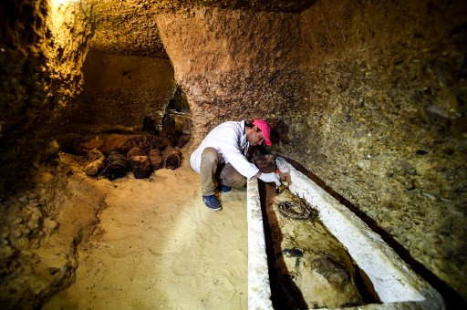 An archeologist brushes a newly-discovered mummy laid inside a sarcophagus, part of a collection found in burial chambers dating to the Ptolemaic era (323-30 BC) at the necropolis of Tuna el-Gebel in Egypt's southern Minya province, about 340 kilometers south of the capital Cairo, on February 2, 2019. (AFP/Mohamed El-Shahed)