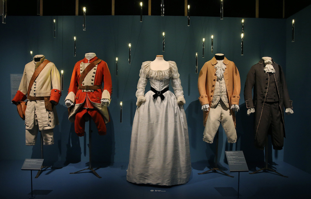Lady Lyndon's dress (C) and uniforms worn by French and British soldiers during the seven year's war, original costumes from the film 'Barry Lyndon' (1975), are displayed as part of the Stanley Kubrick exhibition at the Design Museum in Kensington, London, on April 26, 2019. Twenty years after the death of US director Stanley Kubrick, the British have rediscovered the director who had a special relationship with the United Kingdom, where he lived and worked. (AFP/Isabel Infantes)