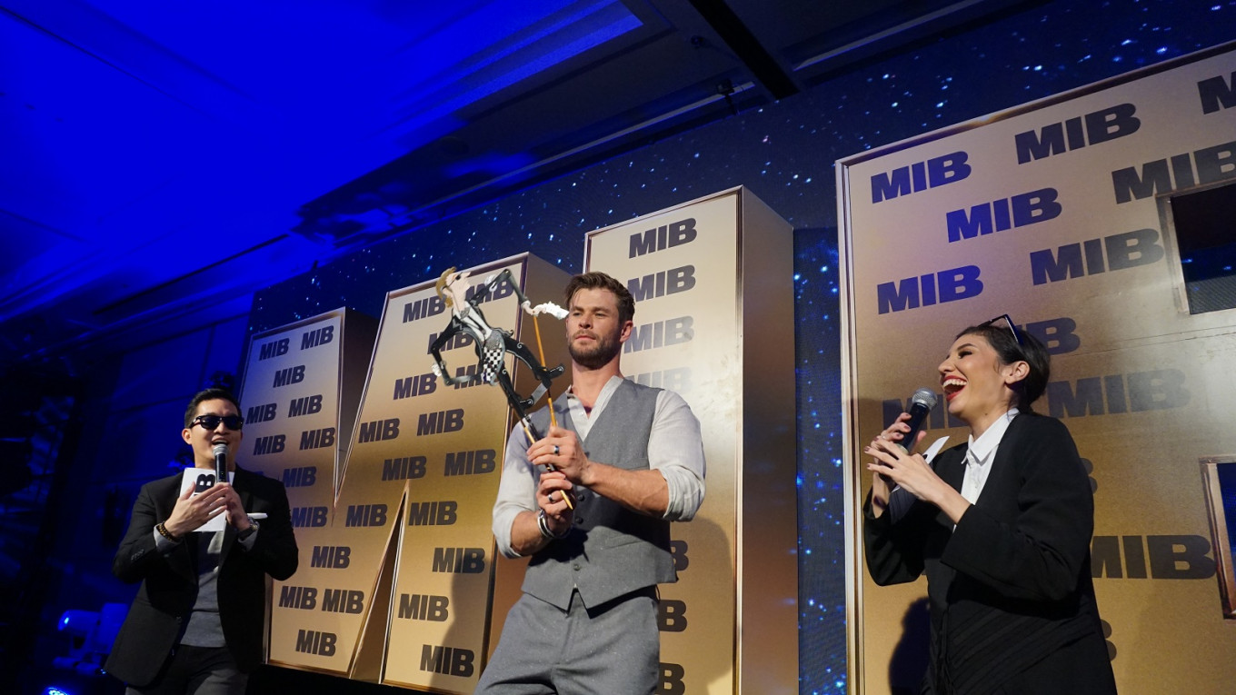 The actor was there to promote his upcoming movie Men in Black: International, receiving a special gift from a fan in the form of a wayang (shadow puppet) dressed like an MIB agent from the popular film franchise. (mut)