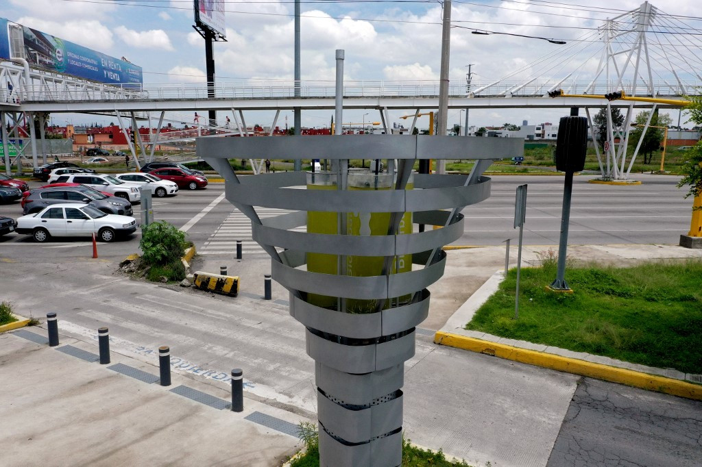 Designed by a Mexican start-up, the towering metal structure uses microalgae to clean carbon dioxide and other contaminants from the air, returning pure oxygen to the environment.