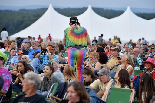 Guests attend the 50th anniversary celebration of Woodstock at Bethel Woods Center for the Arts on August 15, 2019 in Bethel, New York. Organizers of the Woodstock weekend, whose 50th anniversary starts August 15, originally wanted to hold the event celebrating peace, love and music in its namesake town, long a haven for creative types including Bob Dylan. For space and permit reasons they were forced to look elsewhere -- about 60 miles southwest -- but opted to retain the Woodstock moniker. (AFP/Angela Weiss)