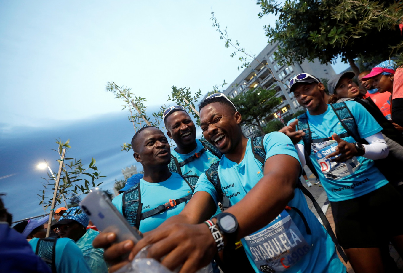 Activist and treegrower Siyabulela Sokomani takes a selfies as he prepares for the start of the Cape Town marathon, in South Africa September 15, 2019. He is one of a group of 20 runners participating in the marathon with saplings on their backs to promote the planting of native trees amid a nationwide push to replace invasive species with indigenous ones to cope with drought and climate change. (Reuters/Mike Hutchings)