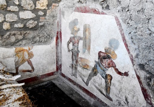This handout picture taken on Oct. 9, 2019 and released on Oct. 11, 2019 by the press office of the Pompeii Archaeological Park shows a fresco depicting a heavily-armed gladiator standing victorious over his opponent gushing blood which has been discovered at Pompeii, Italy's culture ministry said on Oct. 11, 2019. (AFP/Press office of the Pompeii Archaelogical Park)