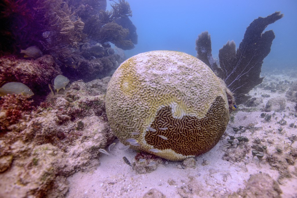 Handout recent picture released on November 11, 2019 by ADAPTUR (a project of cooperation project between Mexico and Germany implemented by the German Cooperation for Sustainable Development (Deutsche Gesellschaft für Internationale Zusammenarbeit, GIZ), the Mexican Ministry of Tourism (SECTUR), the Mexican Ministry of Environment and Natural Resources (SEMARNAT), the National Commission for Areas Natural Protected (CONANP) and the National Institute of Ecology and Climate Change (INECC)) showing a coral off-Mexico's Quintana Roo State, affected by a disease known as white syndrome, which is different from coral bleaching, and more deadly. (Adaptur/AFP/Armando Gasse)