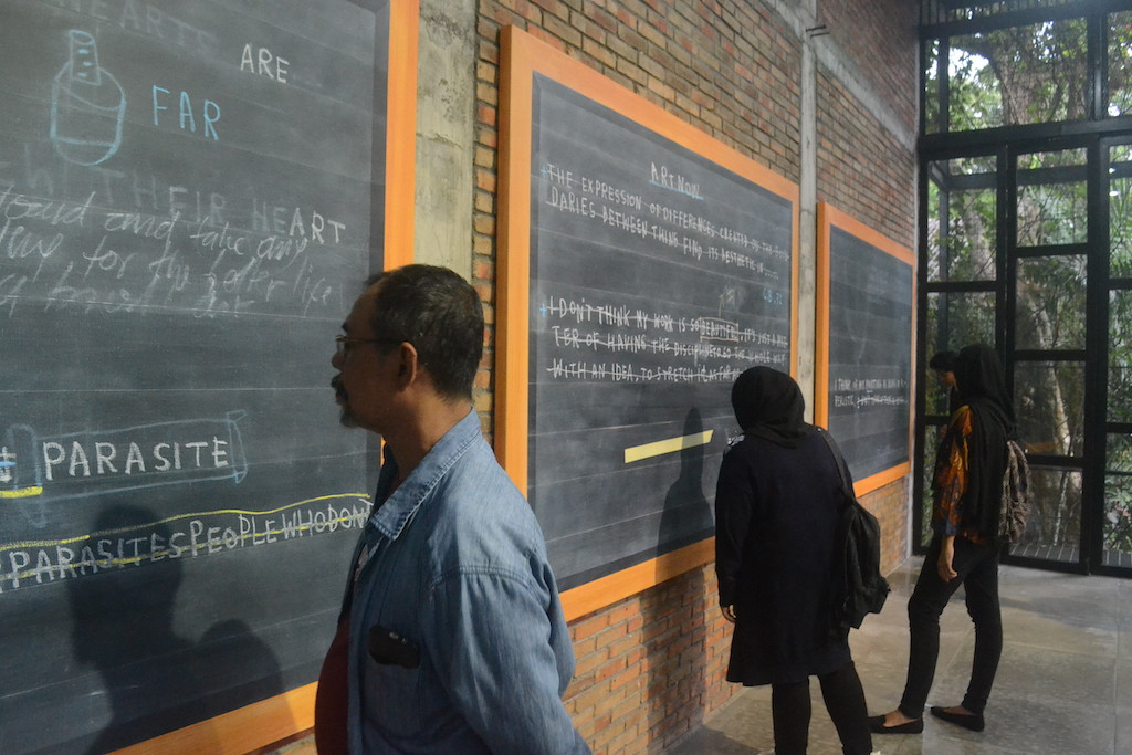 hat appeared to be four large blackboards bearing random words welcomed visitors of SaRang Building in Yogyakarta’s Bantul in late January. Upon closer look, however, the boards turned out to be paintings. Titled “Blackboard Series”, the paintings presented intricate techniques and were the work of Jumaldi Alfi.