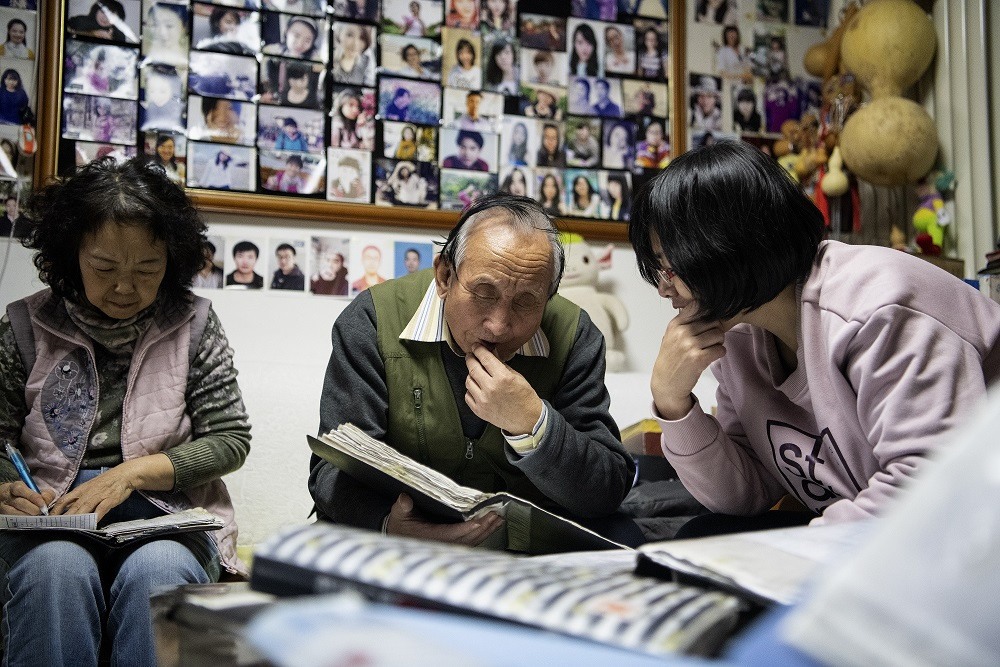 This photo taken on Dec.17, 2019 shows matchmaker Zhu Fang (center) talking to a woman seeking his advice (right) in his house in Beijing. - For almost 50 years Zhu Fang has been one of Beijing's most popular matchmakers, and even now -- aged 75 -- he remains in as much demand as ever. (AFP/Noel Celis)