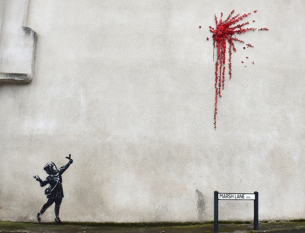 View all search resultsritish street artist Banksy is thought to have given a Valentine's Day gift to his home town of Bristol in western England with the appearance of a new mural showing a small girl with a catapult and a splatter of red flowers.