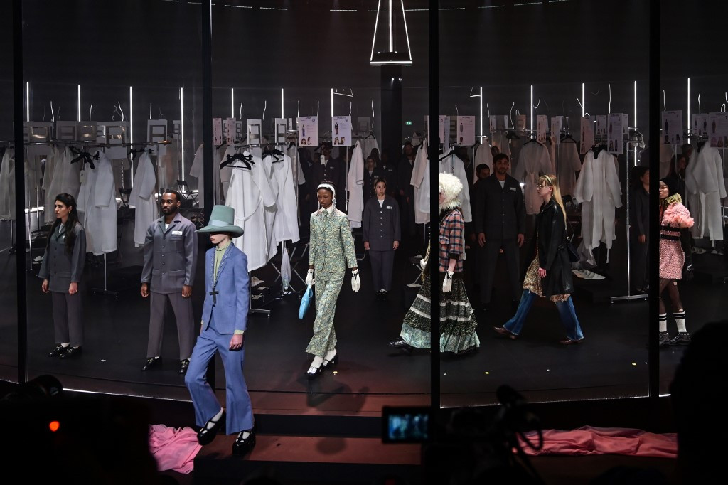 As the show drew to an end, the uniformed dressers replaced the models behind the glass screens, receiving applause from the audience.