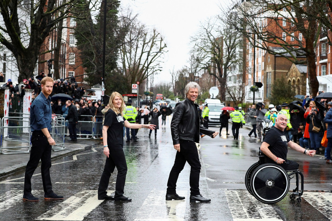 View all search resultsritain's Prince Harry and singer Jon Bon Jovi recreated one of the Beatles' best-known album covers on Friday, walking across the zebra crossing outside Abbey Road recording studios in north London.