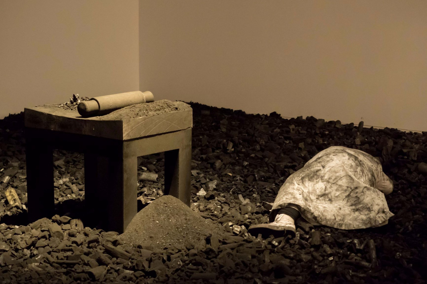 Challenging: 'In I'm a Ghost in My Own House', the artist grinds charcoal in a chore-like process, mirroring the duality of work and liberation as well as destruction and transformation. (Courtesy of Fendi Siregar/-)The piece I am a ghost in my own house, for instance, is infused with an abominable energy of life experience that draws in the audience, evoking their own ordeals in their past or present lives.