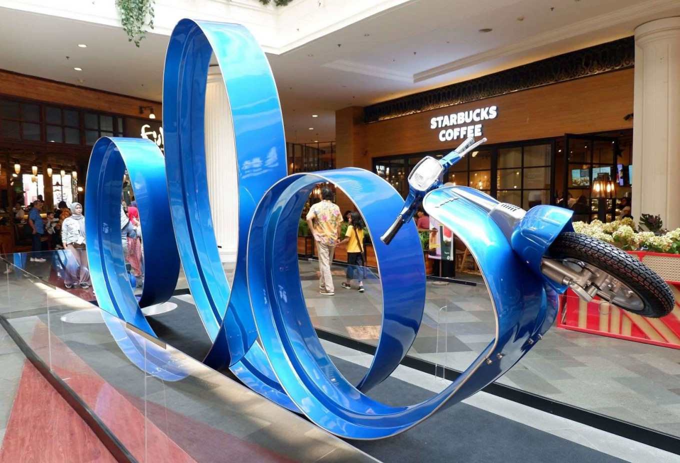 The artwork – a modified blue Vespa that appears to have a very long spiraling seat that curves in a way like a dancing ribbon – was showcased at the 56th Venice Biennale in Italy in 2015. It is now parked at the Gandaria City mall in South Jakarta.