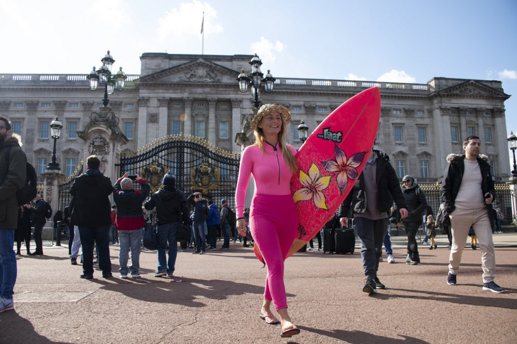 With a wide social media following, her aim is to "educate through entertainment" with spontaneous events in dramatic -- if unlikely -- spots, always in her signature pink, like her eco-friendly surfboard made from recycled coffee cups.