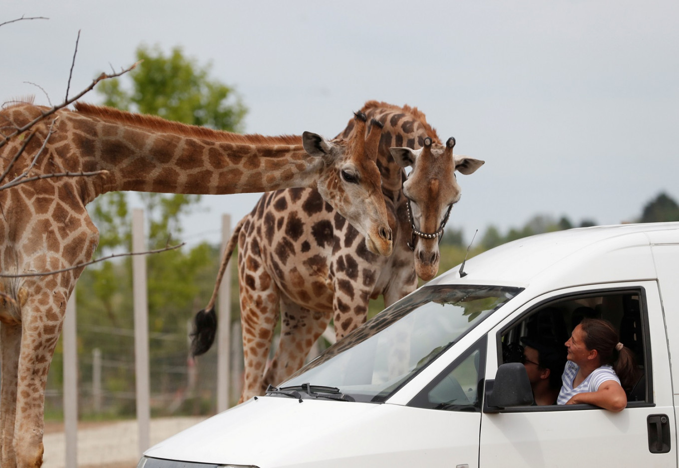 Camels poke their heads through car windows for sticks of carrot. Giraffes and elephants also reach in to help themselves to veggie treats.