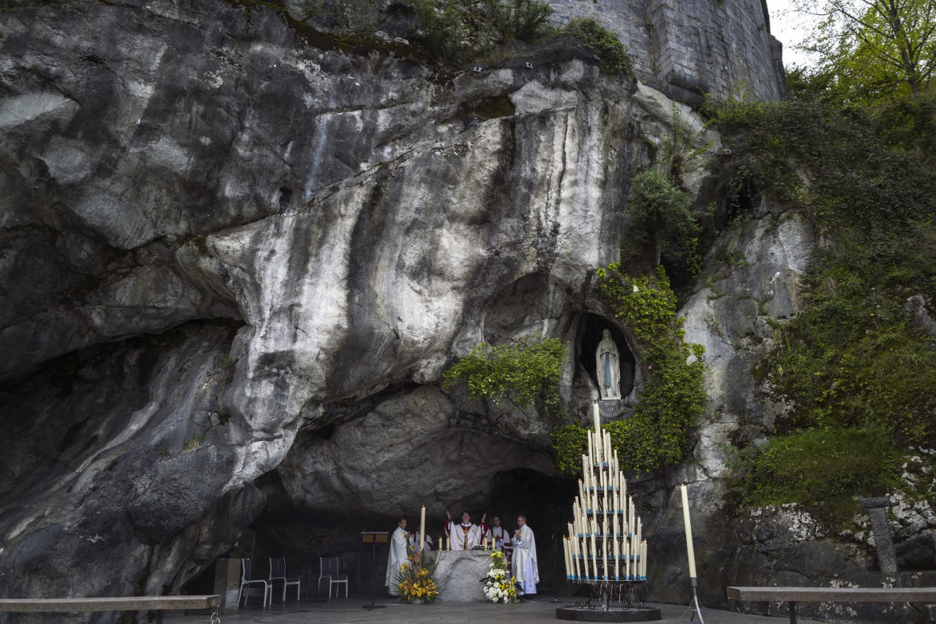 Vice-rector of the Sanctuary of Our Lady of Lourdes, bishop Xavier d'Arodes (C), holds an Easter Sunday service, livestreamed on social media, at the empty Grotte de Massabielle on April 12, 2020, in Lourdes, southwest France, as the Catholic pilgrimage site is closed to the public due to a strict lockdown across France to stop the spread of the COVID-19 pandemic, caused by the novel coronavirus. (AFP/Lionel Bonaventure)