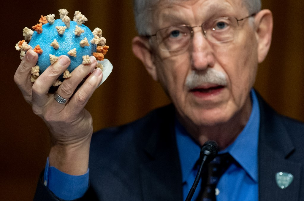 Director of the National Institutes of Health, Dr. Francis Collins, holds a model of the coronavirus as he testifies at a US Senate hearing to review Operation Warp Speed: the researching, manufacturing, and distributing of a safe and effective coronavirus vaccine, in Washington, DC, on July 2, 2020. ( AFP/AUL LOEB / POOL)