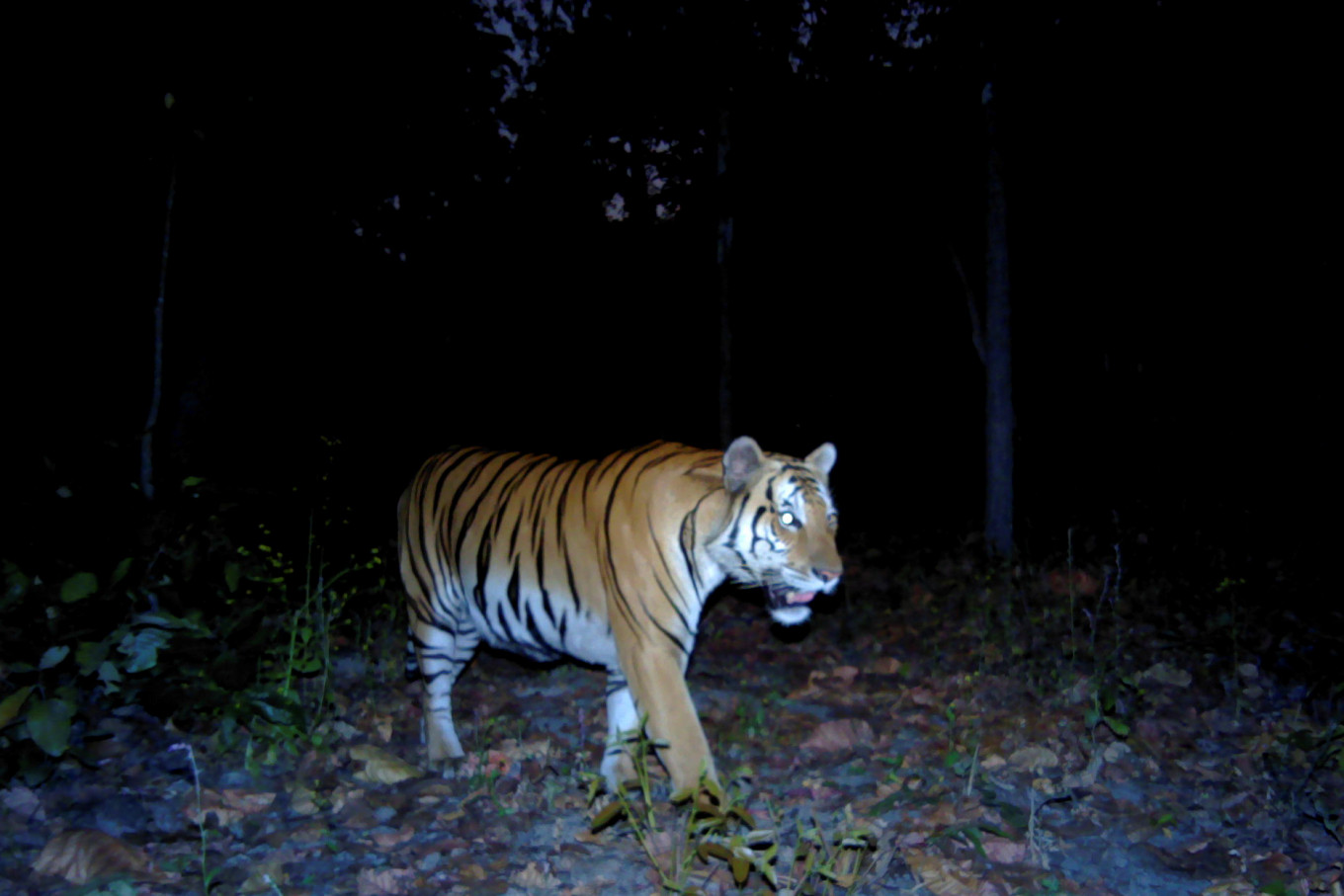 The video and photographs show three male tigers roaming at night, including at one point peering directly into one of the camera traps.