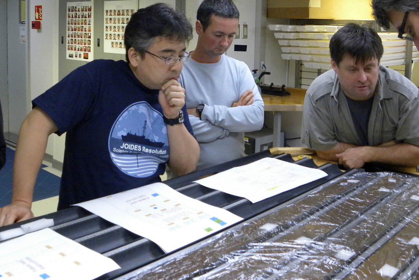 Researchers Yuki Morono, Laurent Toffin and Steven DÕHondt (left to right) work aboard the research drillship JOIDES Resolution with sediment cores gathered from deep beneath the seafloor under the Pacific Ocean in this undated photograph released on July 28, 2020. (Courtesy of /IODP JRSO/Handout via REUTERS)