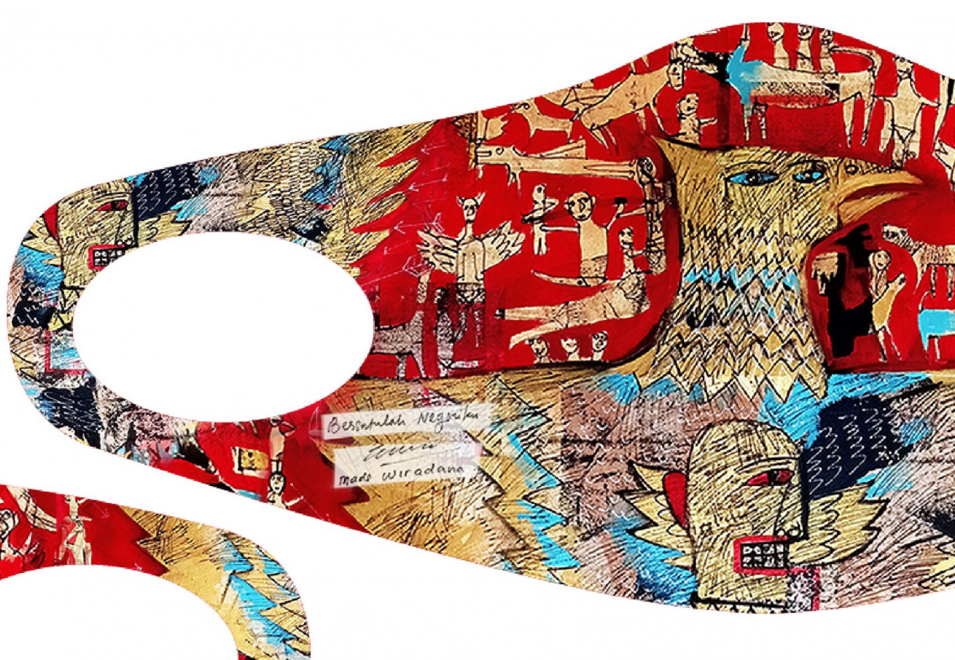 Original work: 'Bersatulah Negriku' (Unite My Country), a 2020 painting by I Made Wiradana, is the original source for the Independence Day special edition mask. (Courtesy of KAF/-)Painter Made Wiradana, whose painting Bersatulah Negriku (Unite My Country) was selected for KAF's Indonesia's Independence Day special edition, revealed that Abdes' respect for his artwork was the main reason he agreed to participate in the initiative.