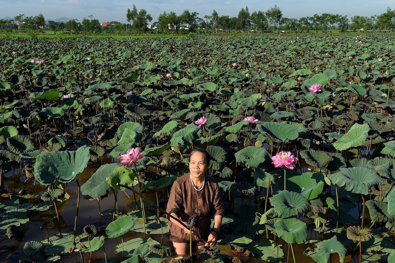 Dressed head-to-toe in brown silk and wearing a pearl necklace -- the same outfit she dons as she picks through the lotus paddies -- Thuan describes her work.