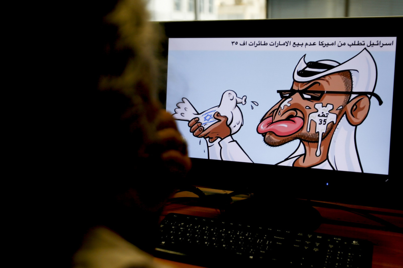 Entitled "Israel asks America not to sell F-35 planes to the Emirates", it shows Abu Dhabi Crown Prince Mohammed bin Zayed Al-Nahyan holding a dove with the Israeli flag painted on it, spitting on the face of the top UAE official, who is also known as MBZ.