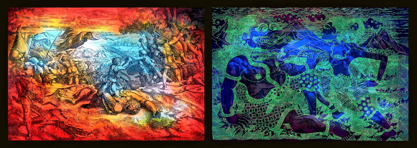 Eddy uses a piece by Italian Renaissance engraver Marcantonio Raimondi, David Beheading Goliath, superimposes it with Latin text from the Dead Sea Scrolls, that renders a rather realistic portrayal of the event that, when turning on a UV light, transforms into the Javanese event in a truly fascinating technical feat.